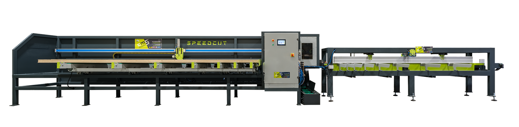 La CMS SPEEDCUT è una troncatrice automatica monolama con spintore posteriore ad altissima velocità, sviluppata per il taglio automatico di tappi e pacchetti di tavole.